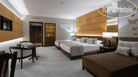 Очень хороший отель, больше конечно для семей с детьми, хотя релакс-бассейн 18+ тоже есть, там очень тихо. Лично для меня (мне лучше где потише))) показался слишком многолюдным и шумным, особенно вечером в главном ресторане. Обслуживание на высоте, любые запросы хоть при обращении на ресепшн, хоть через чат выполняются быстро, в ресторане тоже отличное обслуживание. Пляж хороший (серый песок), большой, свободные лежаки всегда найдешь в любое время. Не очень понравилось, что лежаки слишком близко друг к другу и в пляжной зоне для взрослых 18+ располагаются и с детьми тоже, никто за этим не следит. Детский городок отличный, для детей развлечения на любой вкус. Территория красивая, достаточно большая, зелёная, по дорожкам приятно гулять. С питанием хорошо, но нет такого, что и это хочется попробовать, и то... всего много, но не всё вкусно приготовлено. Особенно для ребёнка было проблематично выбрать мясо - оно и есть отварное, но не прожевать. Рыба тоже сухая и безвкусная. Ребёнок просто выплёвывал. Но все эти субъективные минусы отдых нисколько не испортили. Однозначно рекомендую отель.