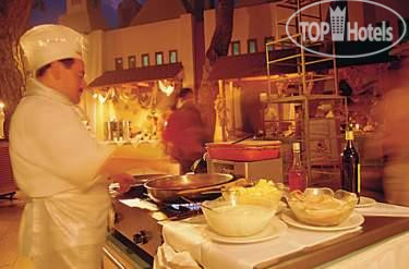 Питание-отличное, на завтрак очень большое разнообразие: тут и смузи видов шести, фреши морковный, клубничный и апельсиновый, отличные пакетированные, фиточаи с травами в кувшинах.Выбор огромный, присутствовала малосолёная рыбка,бастурма, бекон копчёный, буженина,остальное обильно, но, как и везде в хороших отелях.Обед неплох, ужин шикарный, с краснорыбицей запечённой, грилем, мясами,паэльями, ризотто с морепродуктами, кальмарами жареными-пареными, прекрасной выпечкой.Креветки готовятся особо, в соусе и гриле, а не просто висят размороженными гроздьями.По-поводу напитков. По причине нездоровья попробовать удалось немного.Вино красное не глянулось.Порадовал факт наличия тёмного бутылочного эфеса. К слову, попробовала из-за любопытства коктейль- понравился, очень вкусный, ибо готовится по правилам: на натуральнои соке, перемешивается в шейкере.Не понравилось, что за ужином на стол ставятся две бутылки вина и кувшин с водой.Официант не всегда успевает налить каждому.Кувшин с утяжелением внизу, я лично еле ворочала.Использованную посуду убирали молниеносно.Дресс-код на ужине соблюдается, посетители одеты хорошо, но без вызова.Ни о каких пляжных сланцах речи нет.Все немцы благообразны, воспитаны, здороваются при каждом удобном случае.Разительно отличаются от тех, которых можно встретить в других отелях.Но!! Все приёмы пищи проходят в открытом ресторане под навесиками, жара несусветная, на ужине сидишь, прошу прощения, во всём мокром белье.Завтрак терпим, в обед духота.На пляже у скалы функционирует ещё один ресторанчик, заглядывали после обеда, можно перекусить.