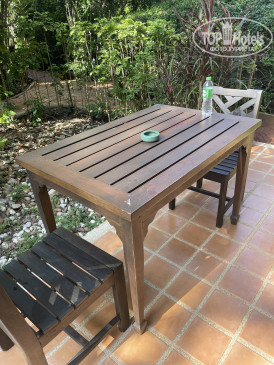 Возле входа в номер есть стол, два стула и пепельница для курящих. Рядом стоит большая кадушка с водой, чтоб можно было промыть ноги от песка(очень удобно).